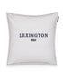 Kaunis, yksinkertainen, Lexingtonin Icons-malliston tyynynpäällinen, värinä valkoinen tummansinisin (lähes mustat) kirjailluin tekstein.